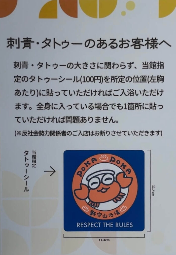 刺青・タトゥーの大きさにかかわらず、指定のシール(100円)を貼ればタトゥーもOK!