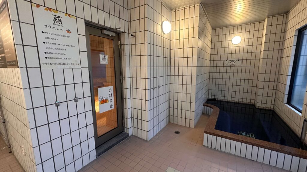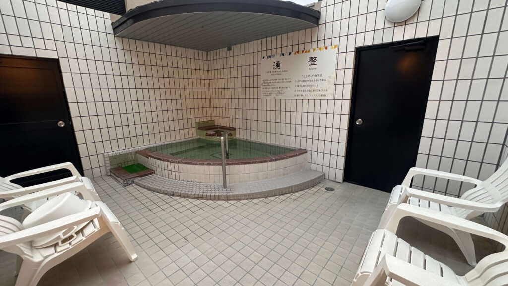 サウナ室の前にはキンキンの水風呂、露天スペースには天然地下水掛け流し水風呂があります。