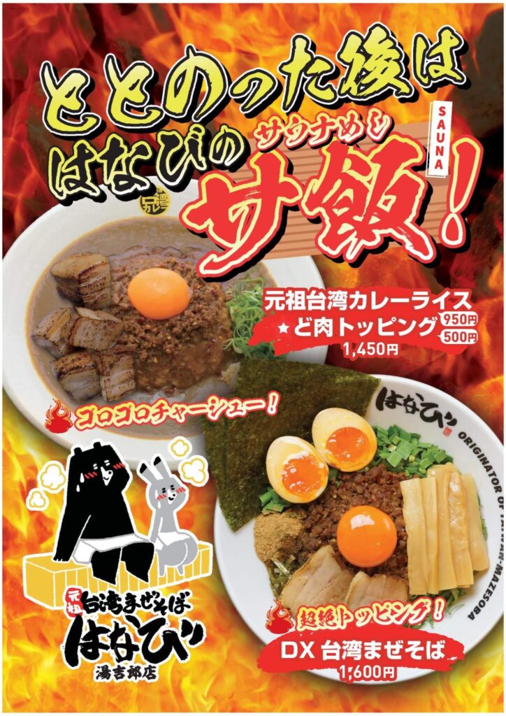 リニューアルで新設された天然温泉のスチームサウナや水風呂、岩盤浴エリアを思う存分楽しんだ後は、ぜひ「台湾まぜそば はなび」でサ飯を。