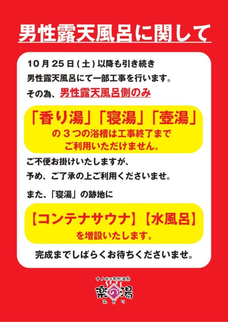 男性露天風呂について、10月25日(土)のリニューアルオープン以降も引き続き一部工事が行われています。