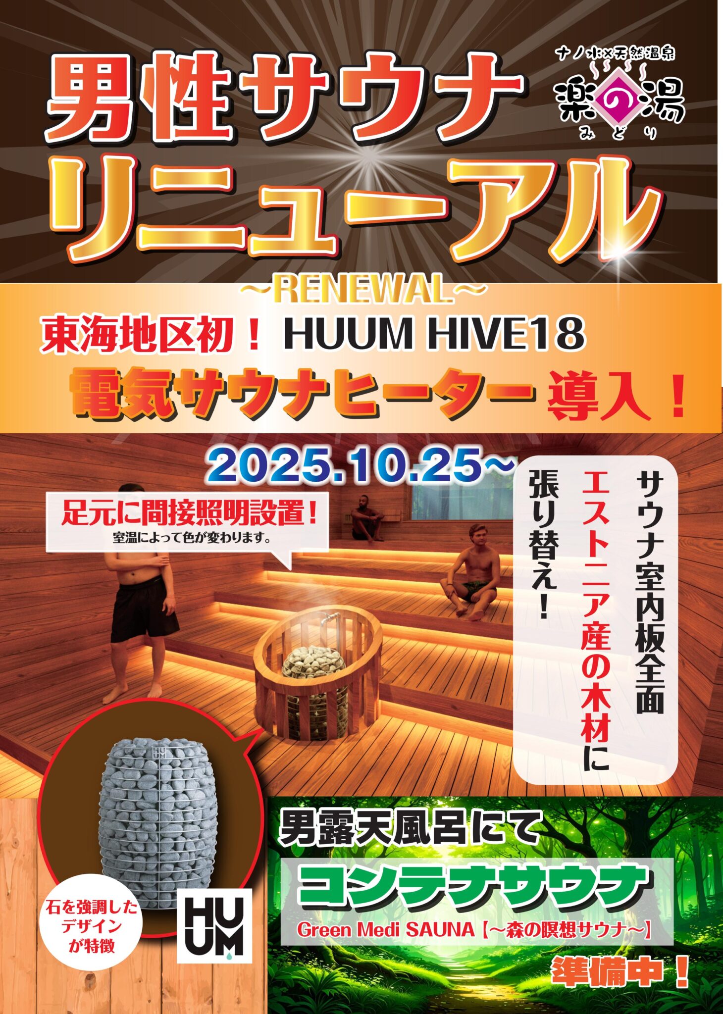 - 男湯スタジアムサウナに東海地区初「HUUM HIVE18」の電気サウナヒーターを導入、時間帯によって照明の色が変化