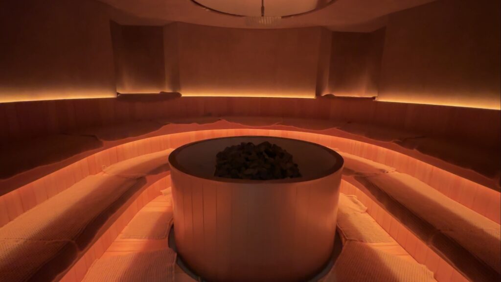 メインサウナは、“黄金の茶室”をモチーフにした会話OKの交流浴サウナ。